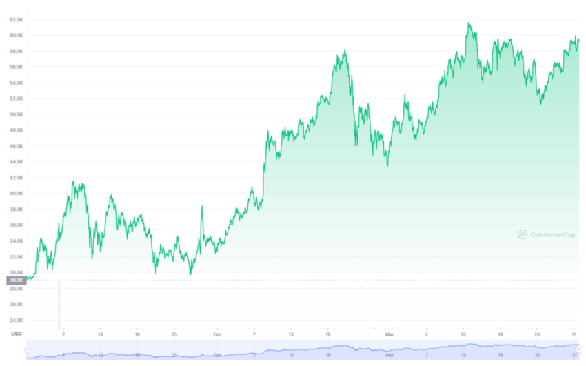 À titre de comparaison, Bitcoin a entamé 2021 à un prix de 28 994 $. Le 13 mars, il a atteint un sommet trimestriel de 61 683 $, avant de perdre 4 % pour clôturer le premier trimestre 2021 à 58 918 $.
