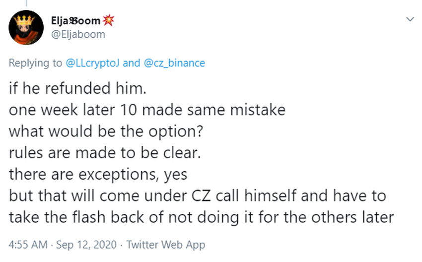 Sponsored SponsoredS’il le rembourse, une semaine plus tard, même erreur. Quel choix aurait-il ? Les règles sont censées être claires. Il y a des exceptions, oui, mais il en revient de la décision de CZ lui-même et il devra subir le contrecoup de ne pas le faire pour d’autres plus tard.