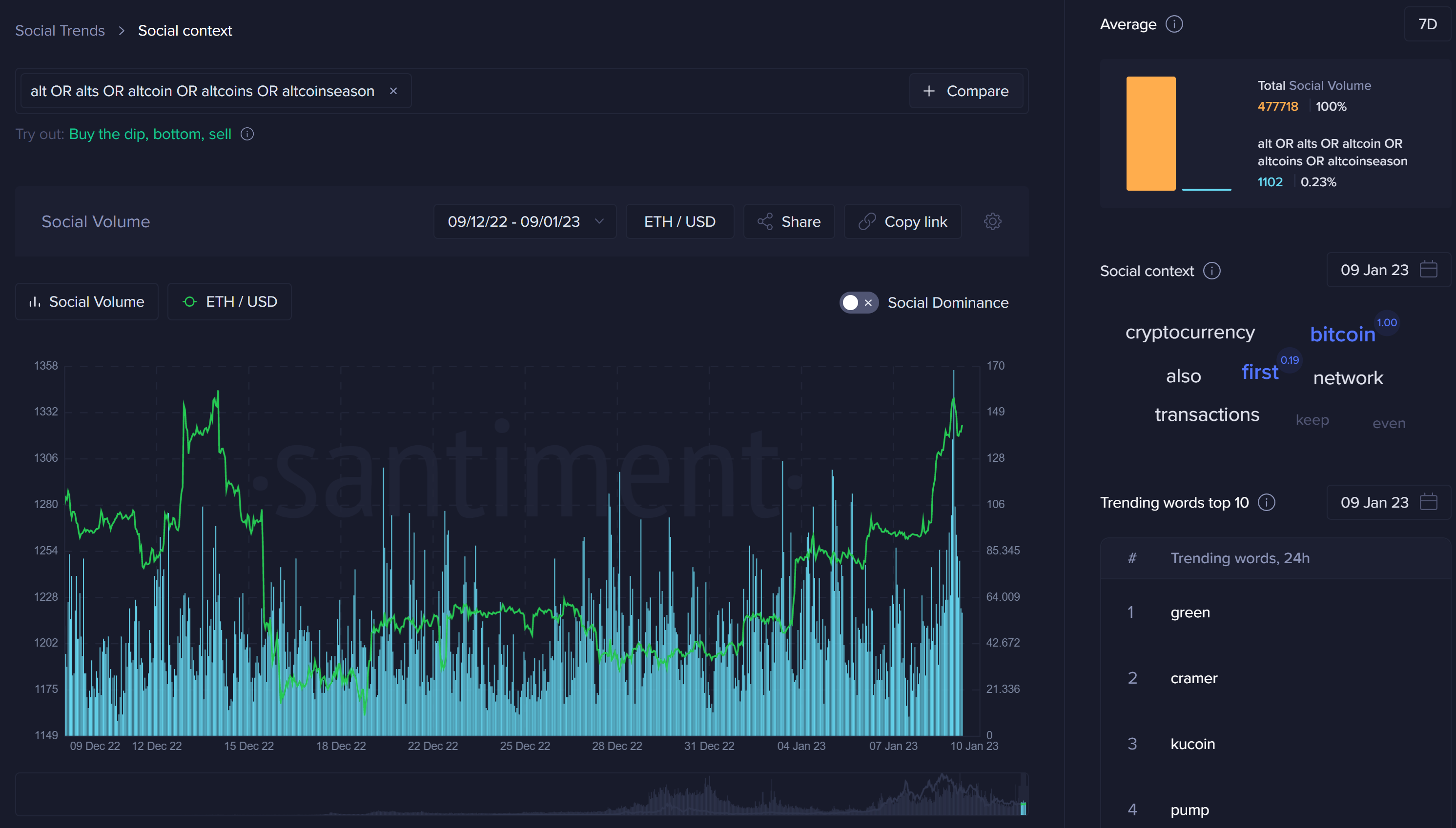 De même, jetez donc un coup d’œil à ce graphique qui illustre la fréquence des mentions de mots tels que altcoin ou altseason par rapport au cours d’Ethereum (en tant que représentation diluée des prix de nombreux altcoins) :