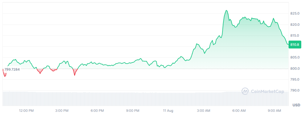 BNB est sans conteste celui qui se rapproche le plus d’un nouvel ATH. Actuellement, son cours oscille entre 812 et 820 $, soit à peine 4,7 % en dessous du sommet de 859 $ atteint fin juillet 2025. Ce niveau témoigne d’une confiance palpable du marché et laisse entrevoir une forte probabilité de cassure à la hausse si la tendance se maintient.