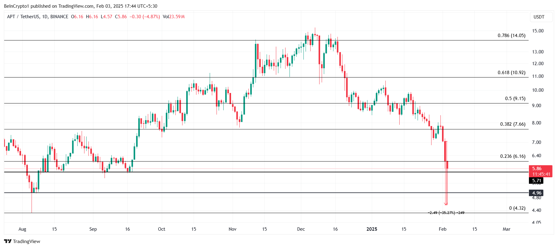 Aptos (APT) a connu une baisse de 35 %, tombant à 4,57 $ dans une chute intra-journalière. Il a au passage perdu un support clé à 6,16 $, lequel coïncide avec la ligne de retracement de Fibonacci de 23,6 %, signalant un potentiel de baisse supplémentaire du cours de cet altcoin.