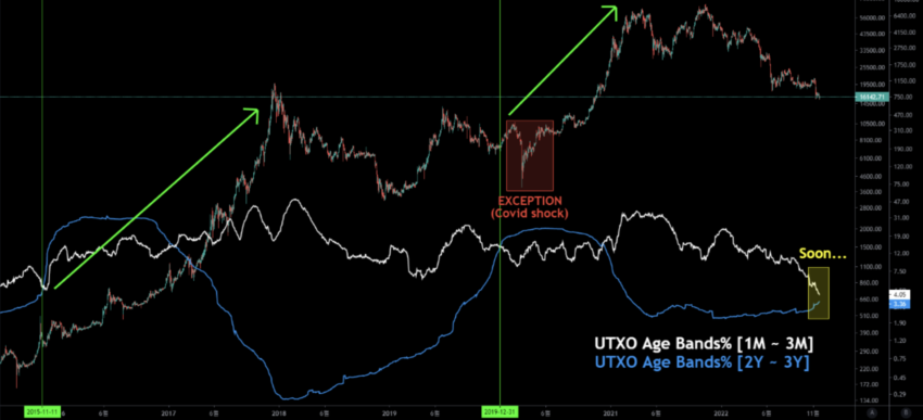L’analyste a avancé qu’une situation de “dead cross” (croisement de la mort) du BTC était à venir et que le cours de l’actif était proche de son bottom. Selon la thèse de l’analyste, lorsque la dominance à court terme de l’indaction UTXO de Bitcoin passe sous la dominance à long terme, l’actif affiche alors une hausse significative.