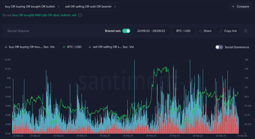 SponsoredTout au long du mois de septembre, les opinions baissières se sont intensifiées, comme le montrent les barres rouges ci-dessous, qui représentent le nombre de mentions de vente, vendre, vendu ou baissier.