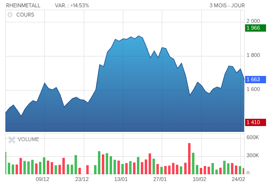 Le secteur de la défense faisait déjà des miracles depuis plusieurs mois, voilà qu’il continue ! Rheinmetall AG, cotée à la Deutsche Börse sous le ticker RHM, incarne cette vague d’intérêt. Avec une capitalisation d’environ 79 milliards d’euros, le titre affiche un cours actuel de 1 666,50 €, en baisse de 3,36 % sur la séance mais en hausse de 6,8 % depuis le début de l’année.