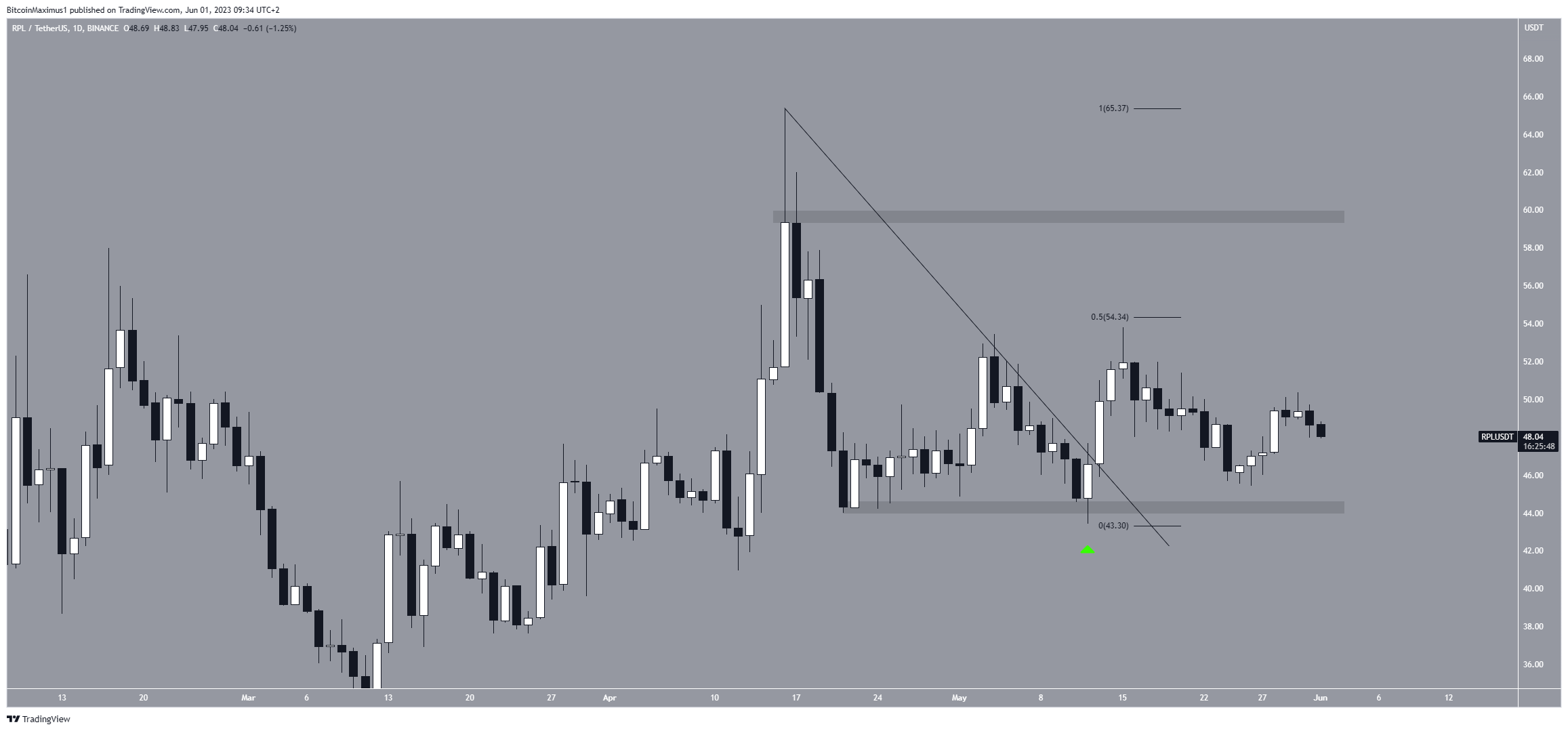 Le cours de l’altcoin RPL évolue à la baisse sous une ligne de résistance descendante depuis son record historique de 65,32 dollars atteint le 16 avril. Cette baisse a conduit à un creux de 43,44 $ atteint le 12 mai.