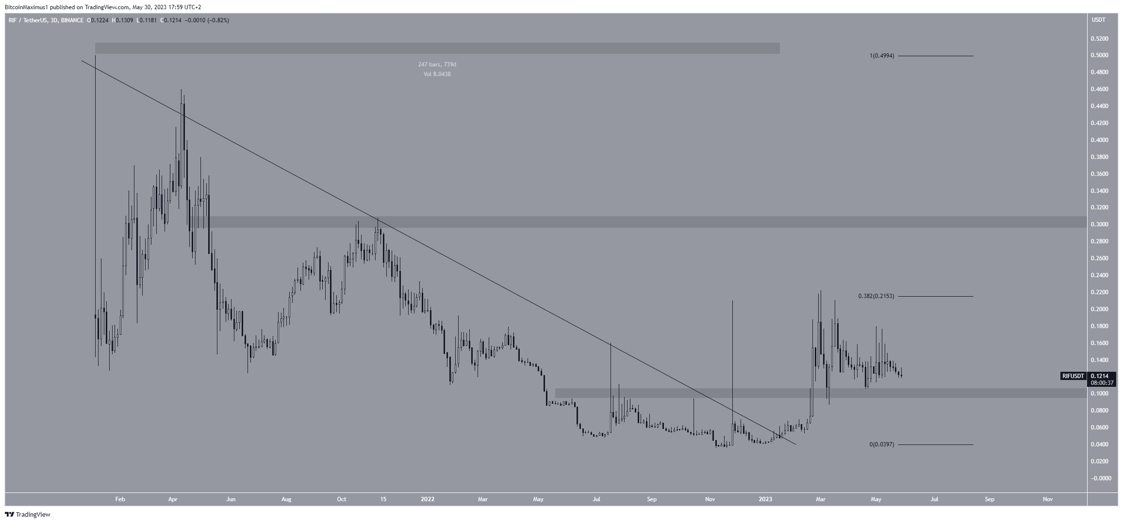 Ce fut également le cas pour le RIF, qui a atteint un nouveau sommet annuel de 0,22 dollar en mars 2023. Depuis, cependant, le cours a chuté suite à un rejet par le niveau de résistance du retracement 0,382 de Fibonacci.