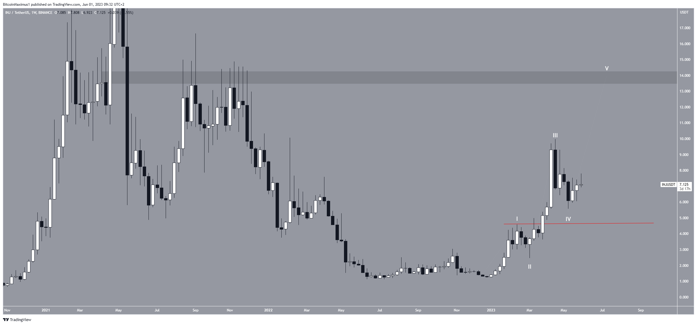 Si son décompte de vagues est correct, le cours INJ devrait terminer sa cinquième vague près de la zone de résistance horizontale de 14 $. Même si cette zone se situe bien en-dessous de son sommet historique, il s’agit de la dernière résistance avant ce dernier.