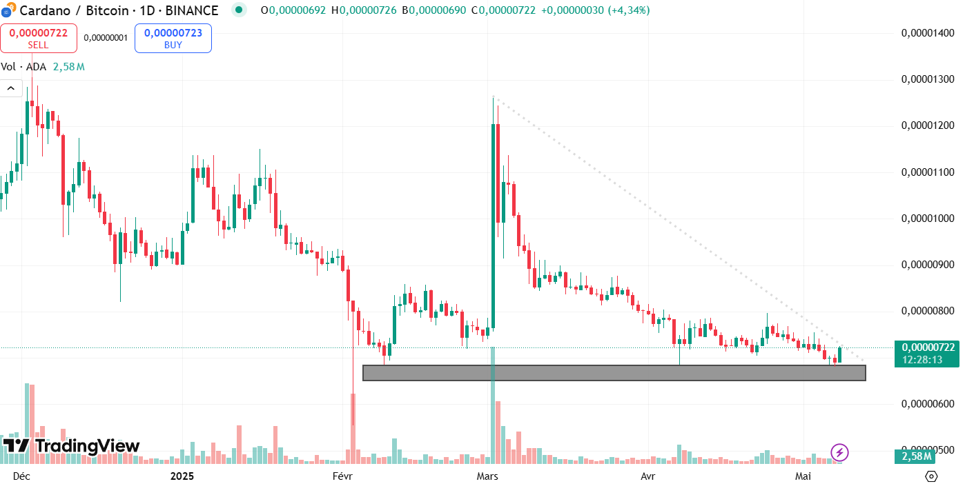 Il se fait assez discret en ce moment et pourtant, Cardano (ADA) pourrait aussi faire des miracles. La paire ADA/BTC est en rebond sur la zone de demande à 0,000006 BTC, où elle semble avoir atteint son bottom. Or, chaque rebond sur celle-ci a mené à une belle hausse.