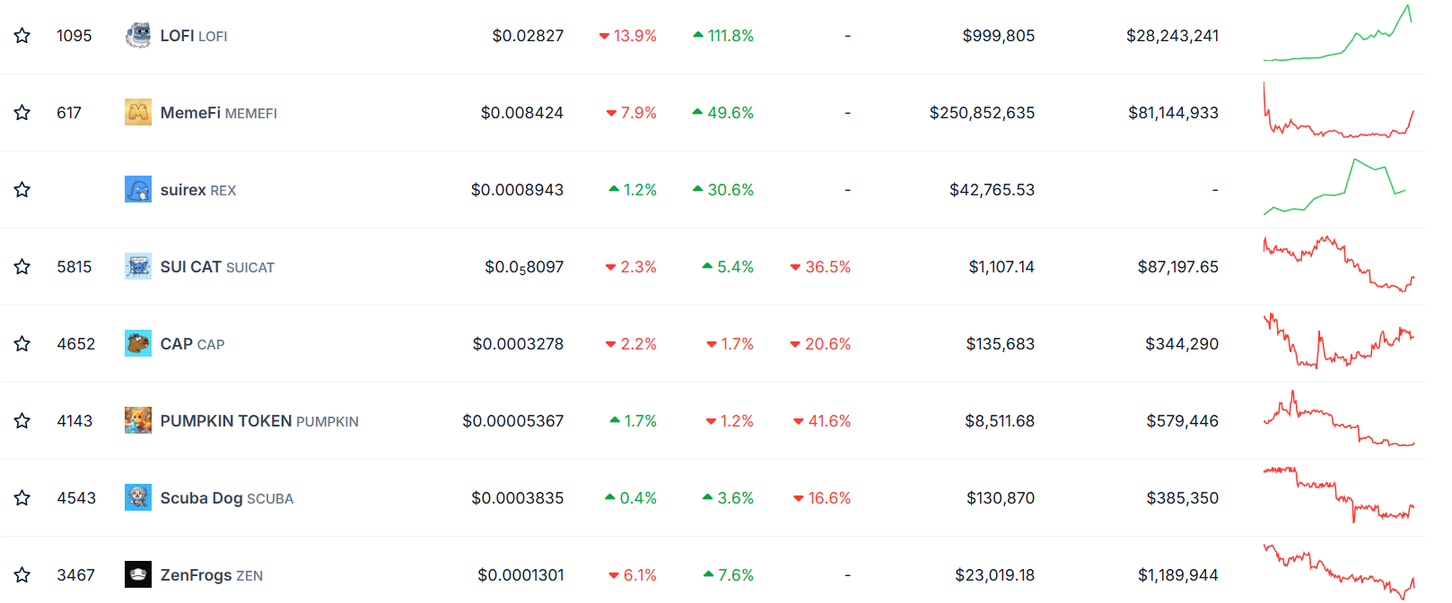 Les grands gagnants du moment se comptent toutefois sur les doigts des deux mains. Ils sont seulement une dizaine à intéresser les investisseurs en ce moment, notamment LOFI (LOFI) avec une hausse de 128 %, suivi de MemeFi (MEMEFI) à 38 % et SUICAT (SUI CAT) à 11 %.