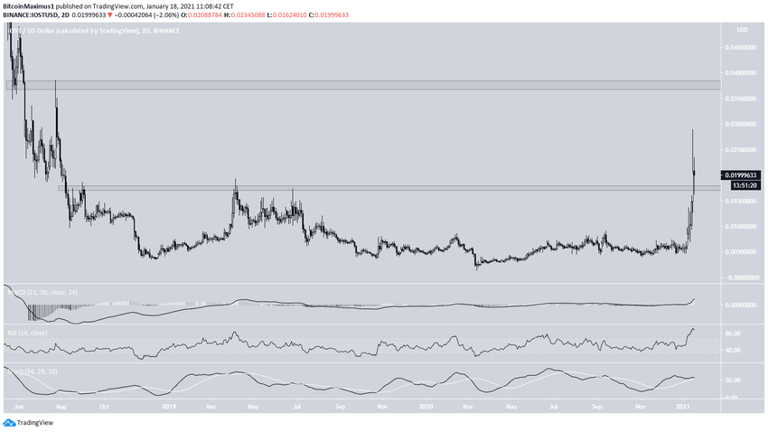Le 15 janvier, l’IOST a regagné la zone des 0,0175$, laquelle opposait une résistance depuis le début de l’année 2018. Il a ensuite validé cette zone en tant que support et se trouve depuis en hausse.