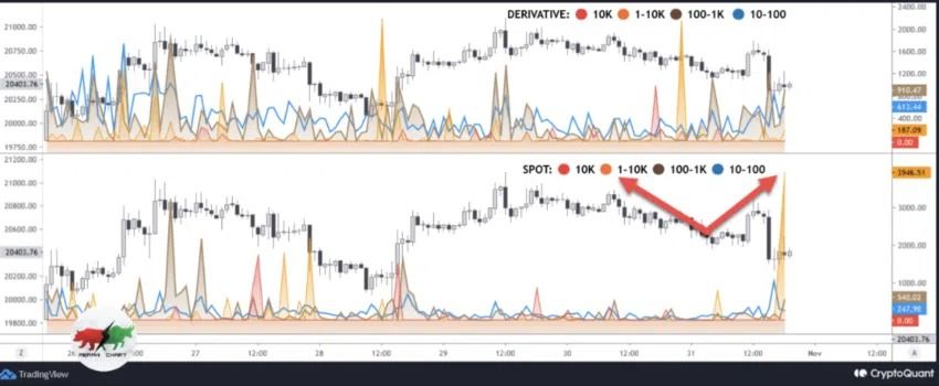 Un autre analyste de CryptoQuant a révélé le 31 octobre que l’activité des baleines Bitcoin était en hausse. En effet, l’analyse a remarqué un pic d’activité significatif pour les baleines possédant 1 000 à 10 000 BTC, ce qui représentait le niveau d’activité le plus élevé en octobre.