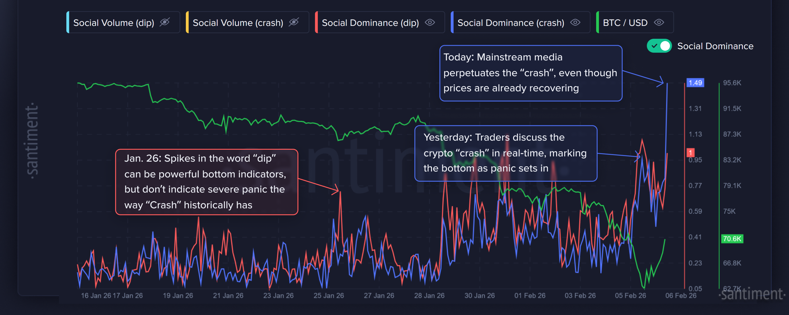 La troisième astuce est de comparer la dominance sociale des termes « dip » et « crash ». Une hausse des mentions de « crash », plus rare et catastrophique, indique une capitulation plus profonde que les simples baisses temporaires.
