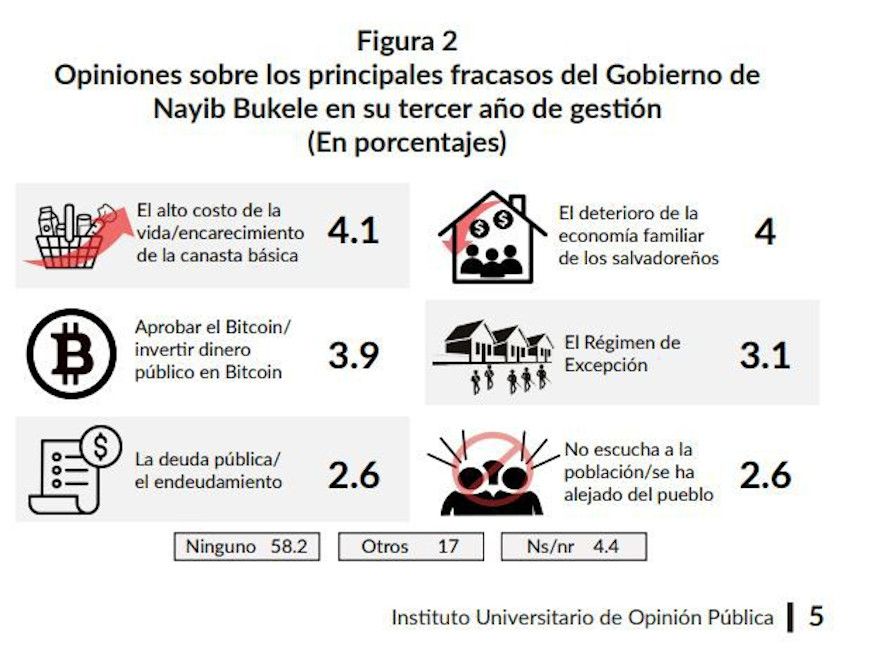 Le rapport soutient que la loi Bitcoin est considérée par les Salvadoriens comme “l’un des échecs du gouvernement Nayib Bukele”, puisqu’ils considèrent que le gouvernement “a investi de l’argent public dans l’achat de BTC”, avec 3,9%. Parmi les autres points de discord, on retrouve : le coût de la vie élevé (4,1%), la dette publique (2,6%), la détérioration de l’économie familiale (4%), le régime d’exception (3,1%) et le fait que le gouvernement “n’écoute pas la population” (2,6%).