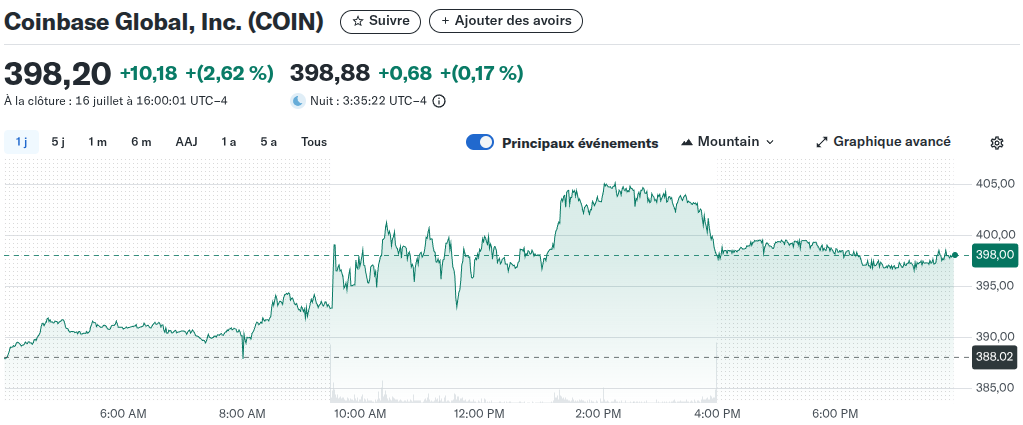 L’action COIN a atteint un nouvel ATH à 405,88 $ et une clôture record à 398,20 $ hier, après une hausse de +2,6 % sur la journée et +6,5 % sur la semaine.