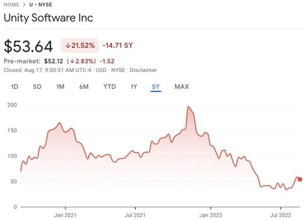 Fin 2021, Unity détenait une part de 61% du marché du gaming. D’où l’incroyable performance de son action tout au long de l’année dernière. Ceci dit, Unity n’a pas échappé à la crise actuelle des actions technologiques. Mais, son incursion dans le secteur des jeux est susceptible d’en faire l’un des pionniers du web3.
