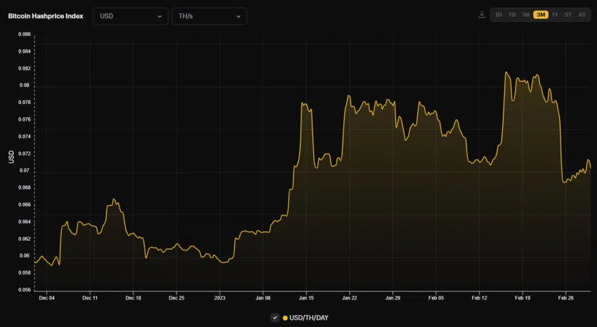 Enfin, la rentabilité du minage Bitcoin s’élève actuellement à 0,07 $ par terahash et par jour. Cela représente une hausse de 18,6% par rapport au 1er janvier 2023 et une baisse de 80 % en baisse par rapport à fin 2021.