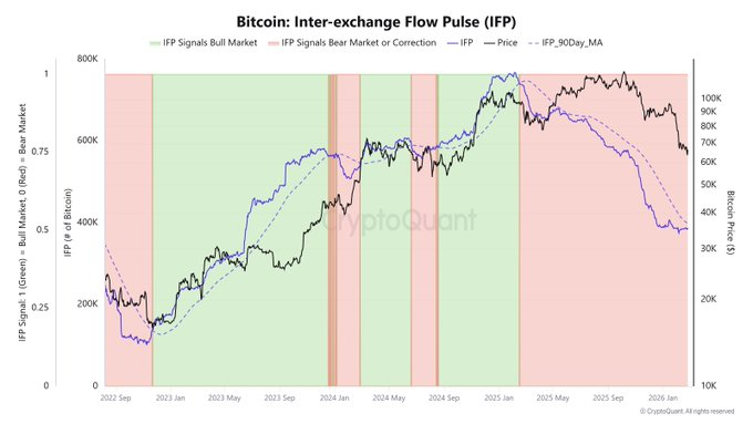 Le cours du BTC stagne autour de 68 000 $. Les indicateurs MACD et RSI affichent des signaux haussiers, tandis qu’une croix dorée se profile sur les flux inter-échanges, avec un afflux vers les dérivés qui signale une participation spéculative accrue.