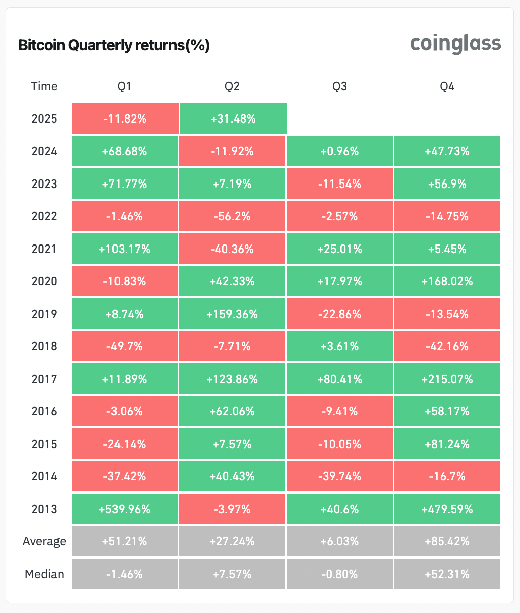 Autre élément qui laisse à penser que le retour de la hausse ne sera pas pour tout de suite : le troisième trimestre a toujours été le moins performant pour le BTC. Ce serait en revanche l’occasion d’accumuler dans l’attente du prochain rebond qui récompensera les plus patients.