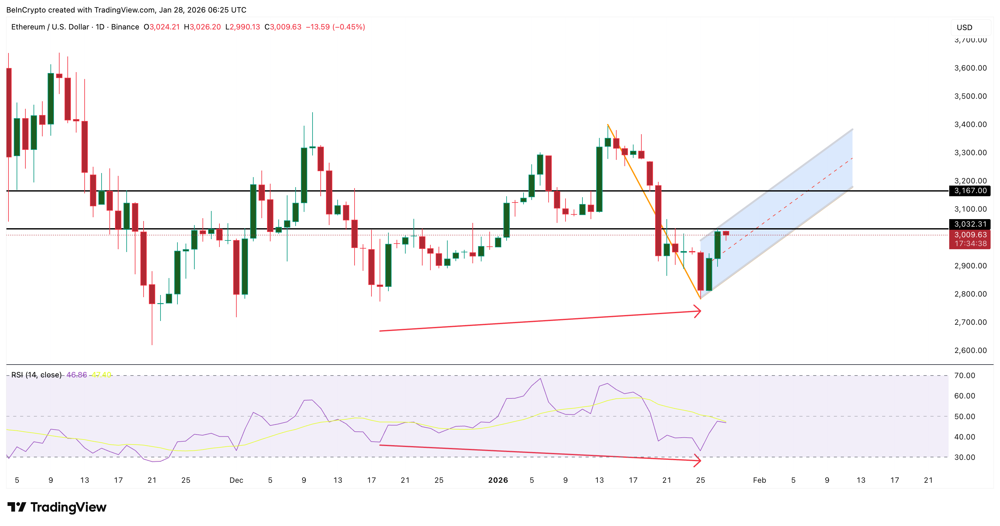 Entre le 18 décembre et le 25 janvier, le cours de l’Ethereum a affiché une divergence haussière cachée : son prix a formé un bottom plus haut alors que le RSI marquait un bottom plus bas, signalant un affaiblissement des vendeurs. Le rebond subséquent a confirmé une stabilisation, évitant une rupture baissière, et une clôture au-dessus de 3 160 $ validerait ce retournement.