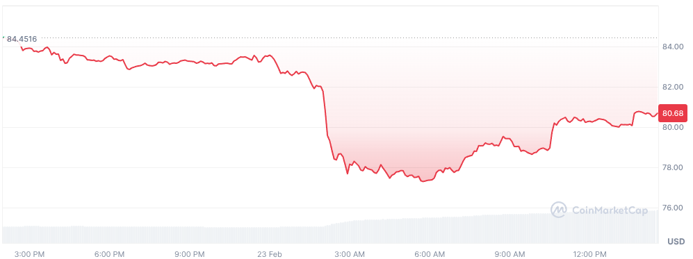 Malgré des signaux mixtes dans l’écosystème, le prix du SOL stagne autour de 82,62 $, en baisse de 3 % sur 24 heures et confirmant une tendance baissière persistante.