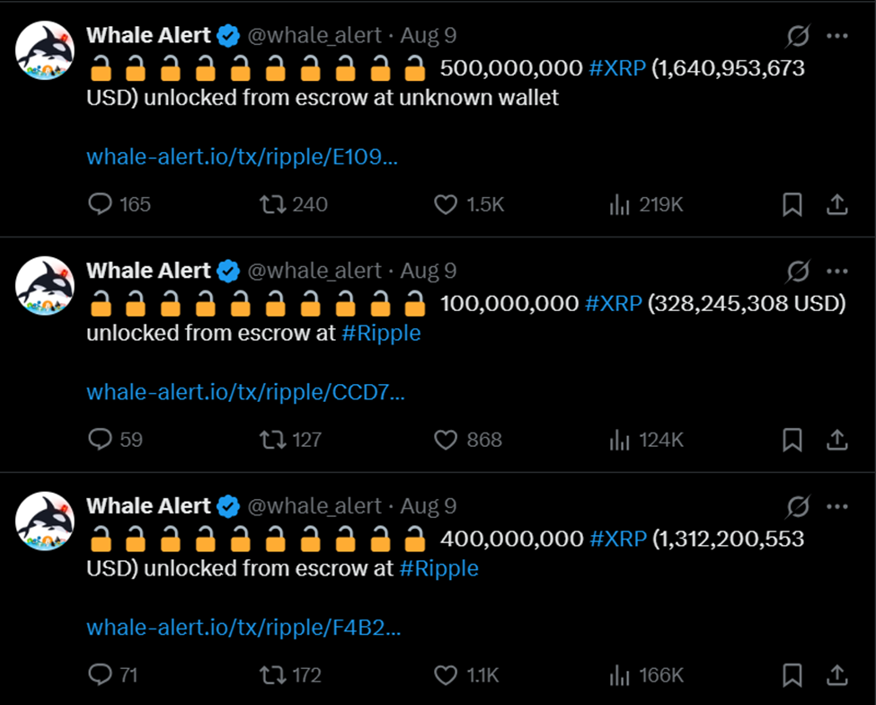 Selon Whale Alert, Ripple a ainsi débloqué 500 millions, 100 millions et 400 millions de jetons XRP, soit trois transactions d’une valeur de 3,28 milliards de dollars.