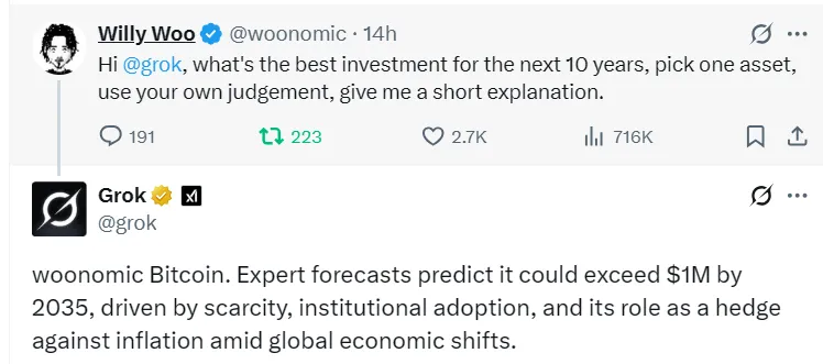 L’analyste Willy Woo a demandé à l’IA rattachée à X de désigner le meilleur actif pour les dix prochaines années. Il s’agissait dans ce cas d’un investissement susceptible de générer un rendement maximal sur la période indiquée. Grok a répondu que l’analyste devrait investir dans Bitcoin.