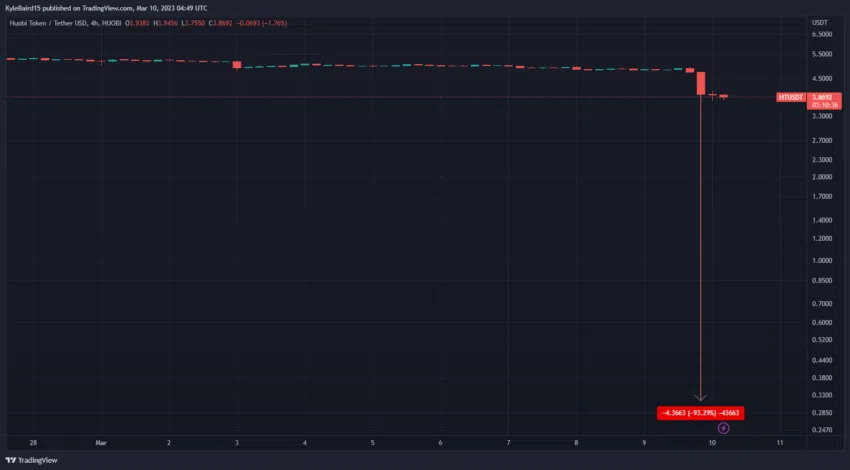 Aux premières heures de ce vendredi 10 mars, Huobi (HT) est passé d’environ 4,70 $ à près de 0,40 $ en seulement quelques minutes.