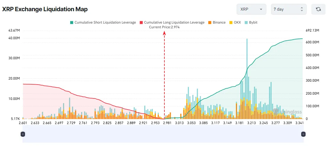 La carte de liquidation XRP est sans équivoque : les positions courtes dominent outrageusement. Les traders parient sur la continuation de la baisse, après une chute de plus de 18% en deux semaines, ramenant le XRP de 3,65 $ à 2,97 $.