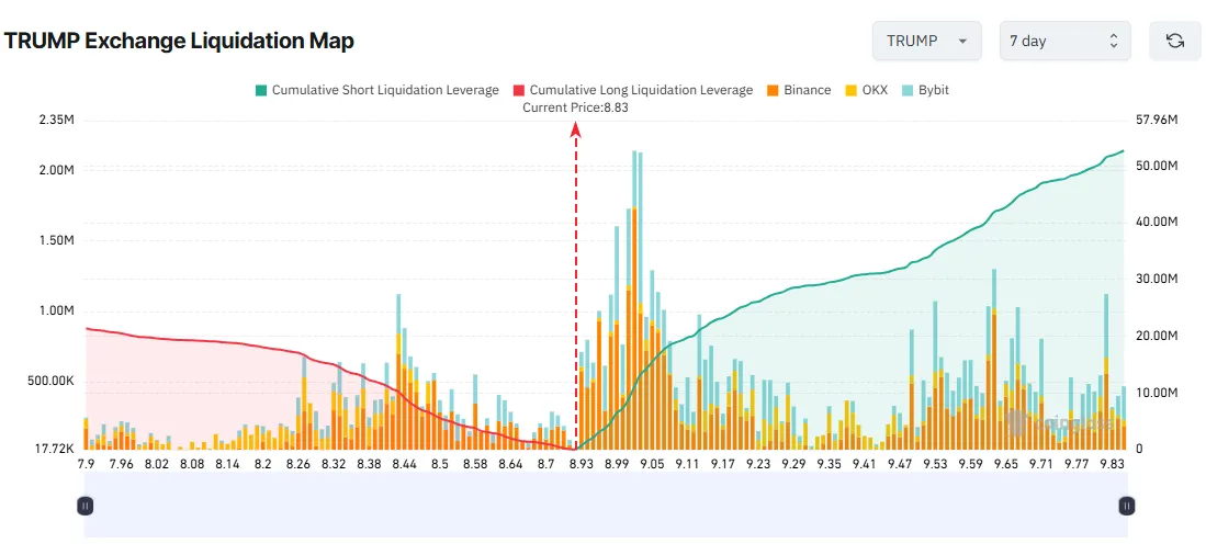 Official Trump (TRUMP) affiche lui aussi une forte exposition des vendeurs à découvert. Son prix se stabilise autour de 8,50 $, un support clé qu’il faut absolument conserver. Cependant, une poussée vers 9,80 $ pourrait déclencher une vague de liquidations de 50 millions de dollars sur les positions courtes.