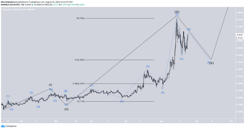 Il semblerait en effet qu’en mars, l’ALGO ait commencé une formation en cinq vagues (en noir dans le graphique ci-dessous). Il serait actuellement dans la vague 4, laquelle s’accompagne d’un décompte de sous-vagues en A-B-C (en bleu).