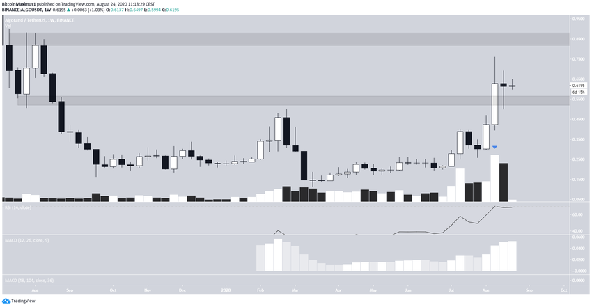 Cela a permis au cours de monter jusqu’au-dessus de la zone de résistance des 0,51$. Il s’agit de la même résistance qui a empêché l’ALGO de continuer sa montée en août 2019. Le cours a ensuite validé cette zone comme support au cours de la semaine suivante.