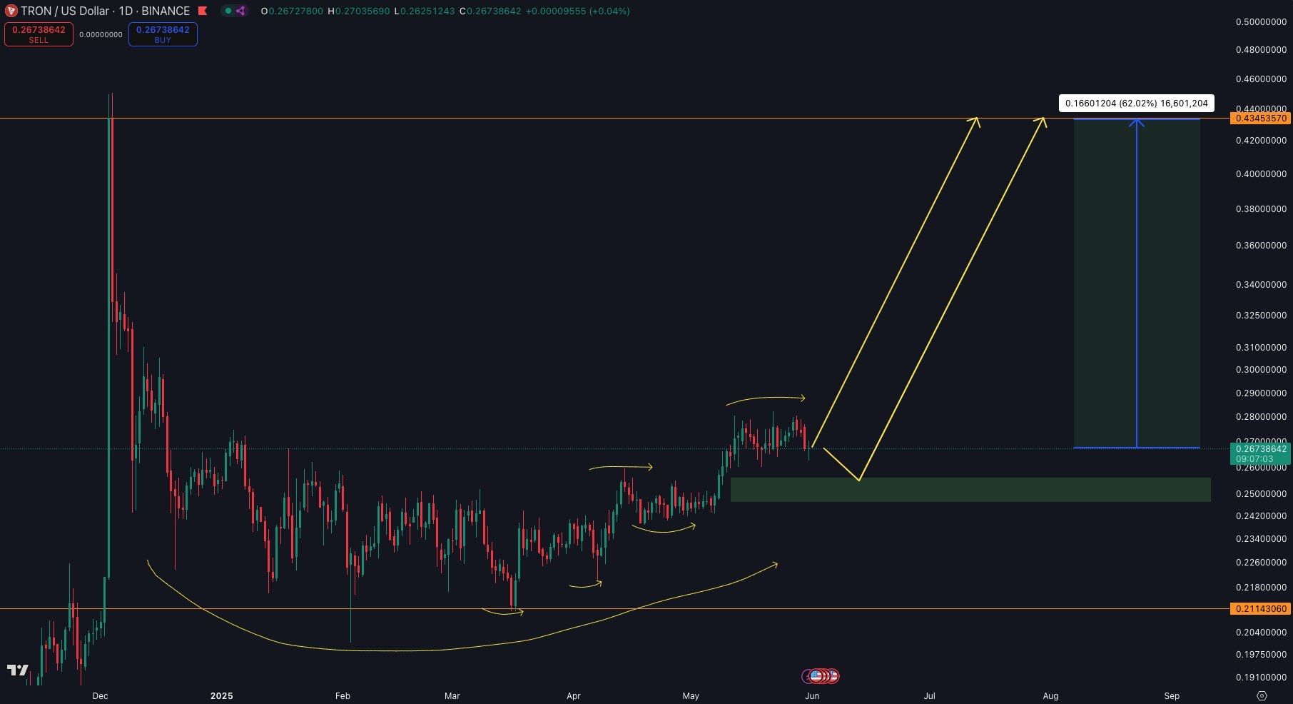 L’analyse de @LennaertSnyder renforce cette vision haussière : malgré le contexte baissier généralisé, TRON continue d’évoluer dans un fort uptrend en unités de temps longues, avec une structure prête à casser sa résistance historique.