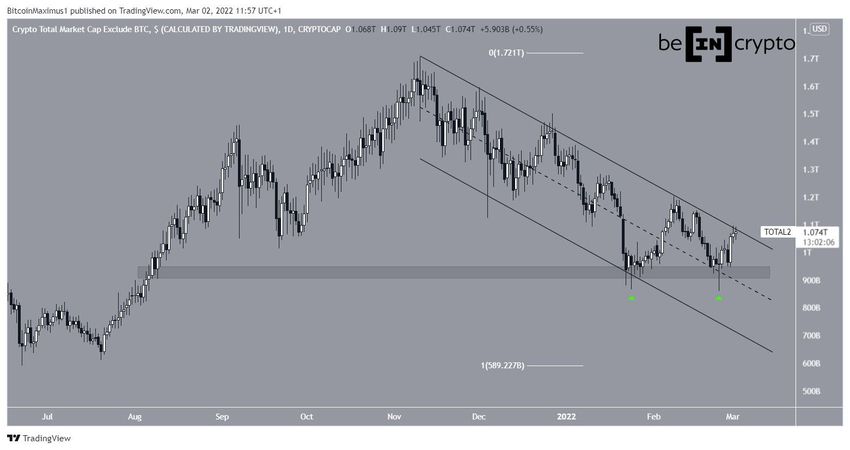 La capitalisation du marché des altcoins est en baisse depuis son cours record de 1,7 billion de dollars, atteint le 10 novembre 2021. La baisse qu’elle a subie depuis lors a conduit à un plancher local de 858 milliards de dollars, ce le 24 février.