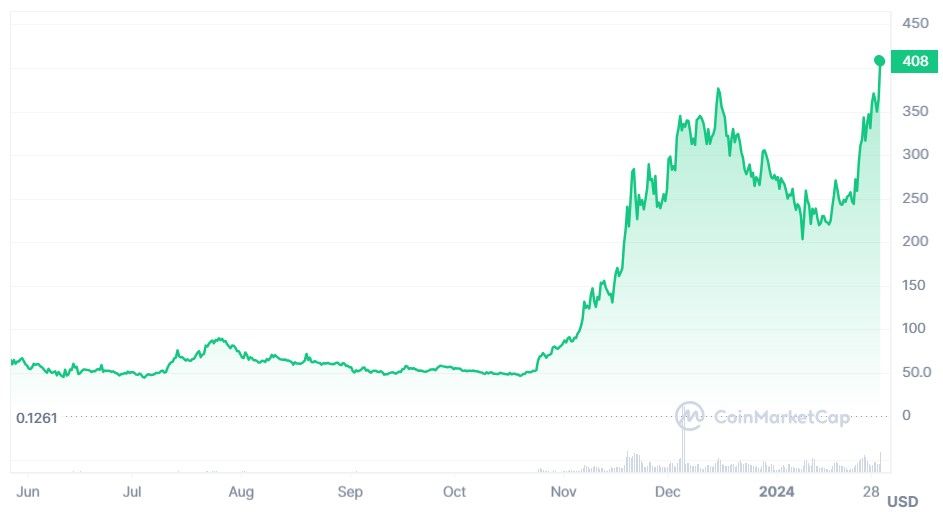 Nous vous en parlions il y a quelques temps, et surtout la semaine dernière : l’altcoin avait entamé un important bull run tandis que les analystes prédisaient qu’il atteindrait rapidement un nouvel ATH. C’est désormais chose faite ! Le TAO trône en ce moment à 411 $, au plus haut depuis son lancement en juin dernier.