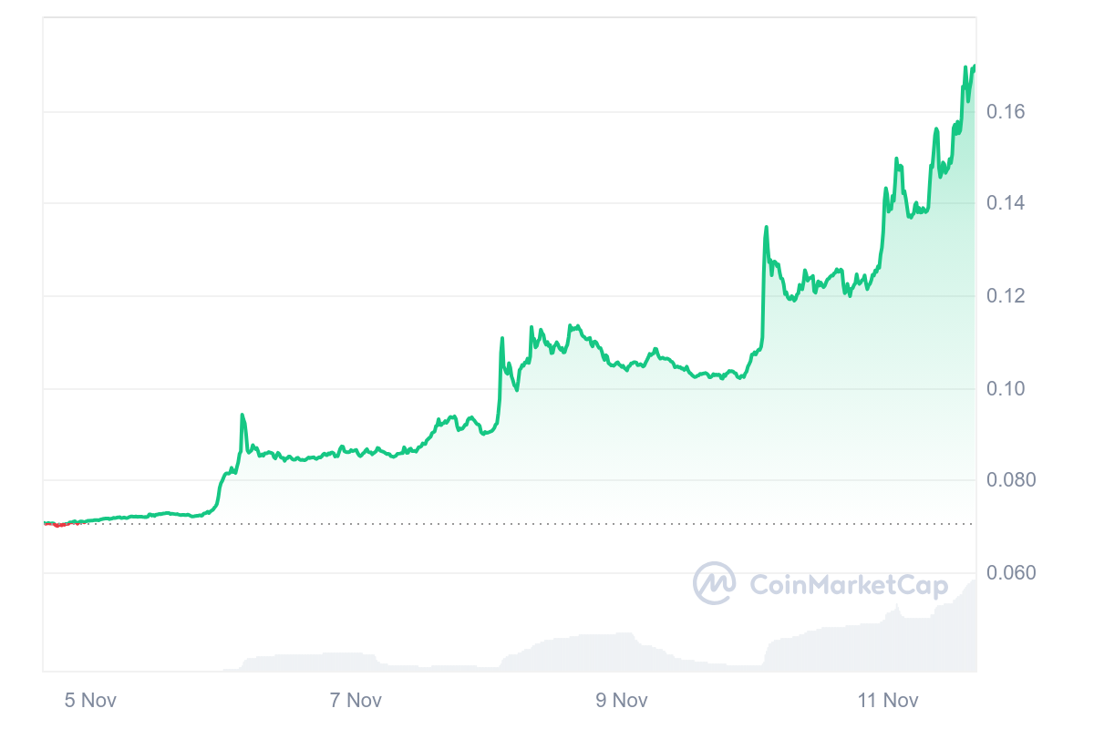 Depuis le 7 novembre, la valeur de CRO a littéralement explosé, enregistrant une hausse de 138,39 %. L’altcoin de l’exchange Crypto.com a même surpassé son ATH de l’année à 0,1575 $ en se situant à 0,1686 $ au moment de rédaction. Toutefois, le CRO reste encore loin de son sommet historique de 2021 établi à 0,9698 $.
