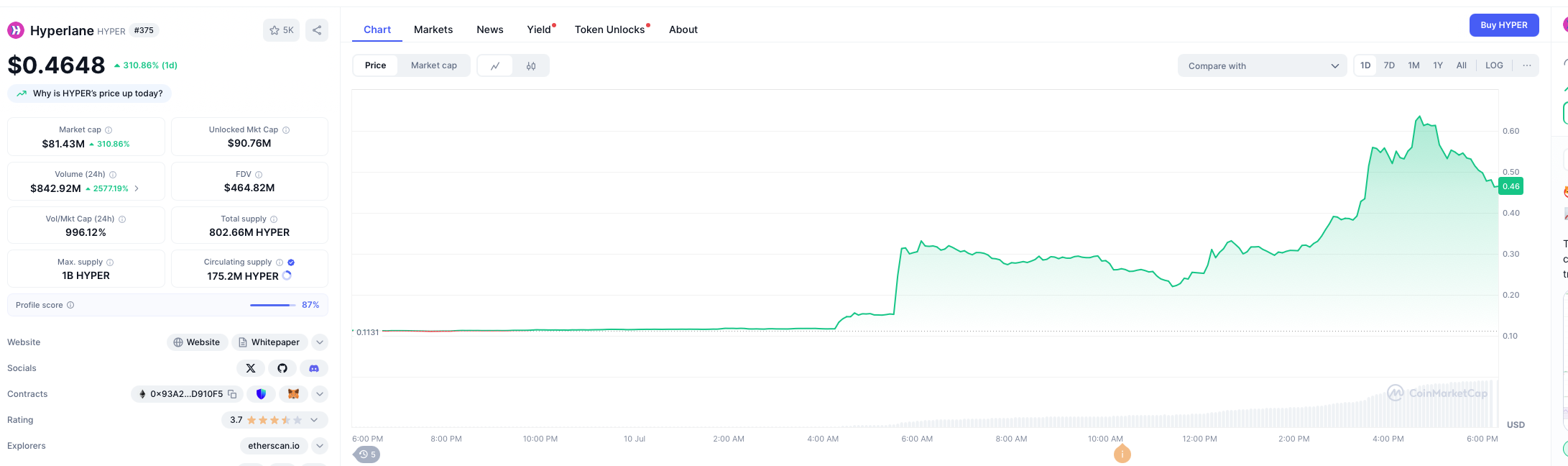 Il ne s’agit pas du token de la plateforme Hyperliquid (HYPE) mais bien d’HYPER, le jeton du projet Hyperlane. L’altcoin réalise un véritable carton sur le marché au moment d’écrire cet article, avec une hausse de 310 % et un volume d’échange qui a bondi de plus de 2 583 % en l’espace de 24 heures seulement. Dans le top 500, aucun autre token ne parvient à faire mieux aujourd’hui.