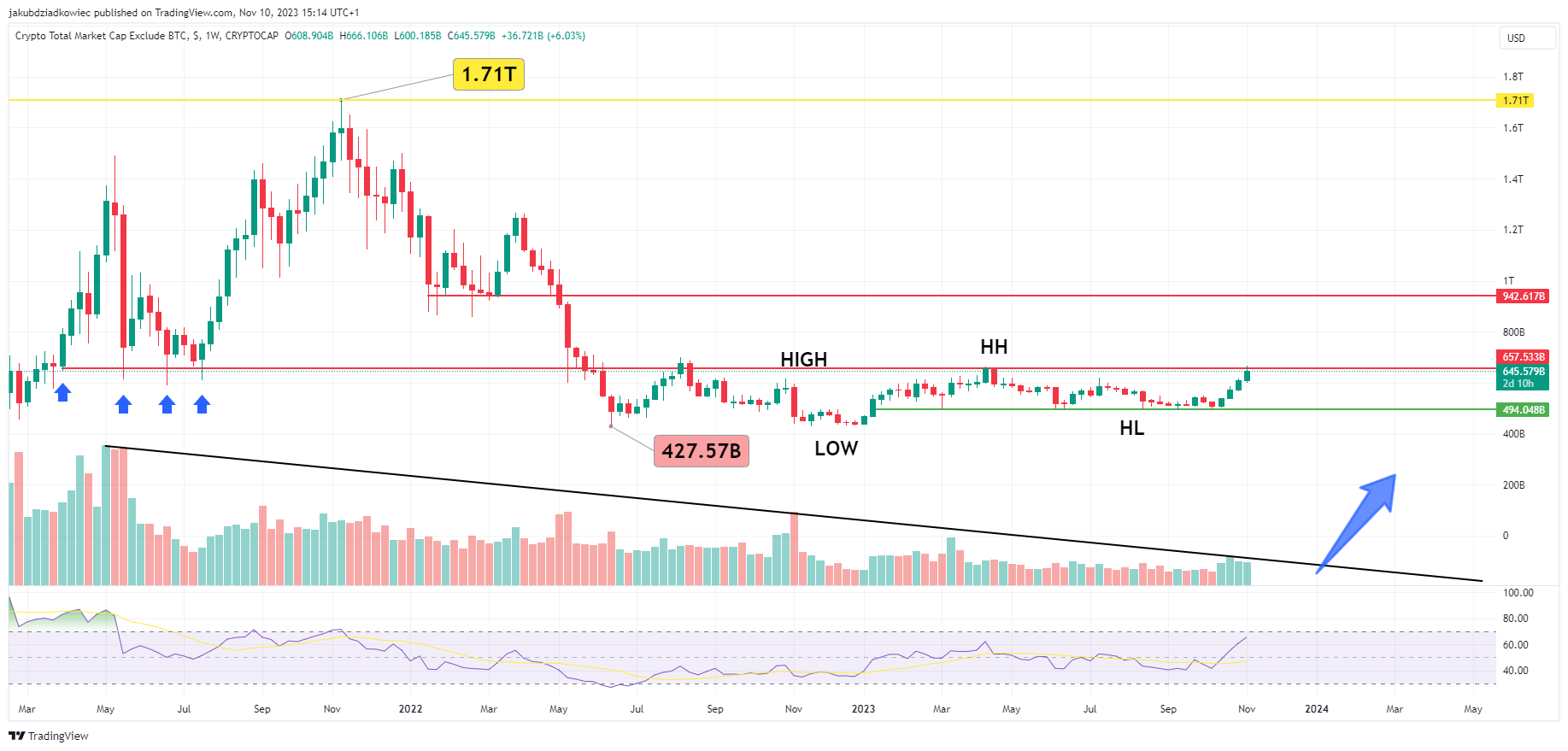Ce mouvement de hausse s’avère important, car il pousse la capitalisation boursière des altcoins vers sa zone de résistance de long terme des 657 milliards de dollars. Cette barrière de résistance cruciale existe d’ailleurs depuis la mi-2022, et a même servi de support à plusieurs reprises pendant le bull market de 2021.