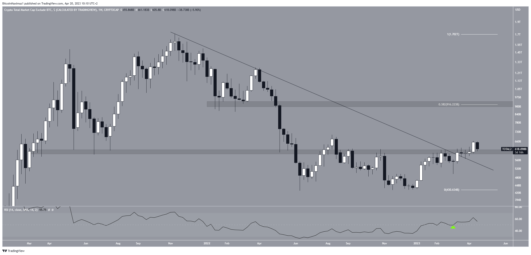 La capitalisation boursière des altcoins a fortement augmenté au cours de la semaine du 10 au 17 avril. Ce faisant, elle a confirmé la rupture d’une ligne de résistance descendante à long terme qui était en place depuis le sommet historique. Elle a aussi aboutit par la rupture de la zone de résistance horizontale de 605 milliards de dollars.