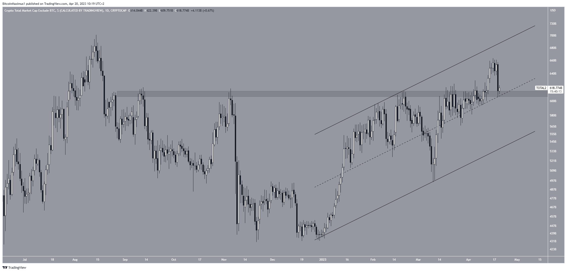 L’analyse technique sur une échelle de temps quotidienne s’aligne avec les lectures du cadre hebdomadaire. Le prix est actuellement en train de retester la principale zone de support horizontale. Sur une vue quotidienne, la market cap des altcoins est de 610 milliards de dollars.