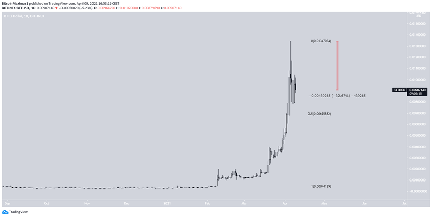 Le 5 avril, le cours de BiTorrent (BTT) a atteint un sommet de 0,0134$ et a créé un chandelier en étoile filante. Ceci est considéré comme un signe de retournement baissier.
