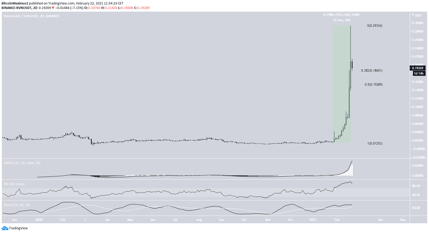 Le RVN vient actuellement d’atteindre le niveau de retracement fibonacci 0,382 à 0,186$, et a amorcé un léger rebond.