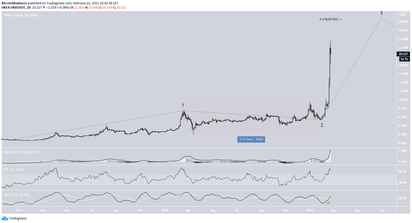 Le cours de l’OKB est en hausse depuis décembre 2018, mais son taux de hausse s’est considérablement accéléré le 23 janvier 2021. À cette époque, l’OKB s’échangeait à 5,13 dollars. Depuis lors, l’OKB a augmenté de 370% pour atteindre un sommet historique de 23,80$ le 22 février. Cette hausse l’a fait monter au 61ème rang en termes de capitalisation boursière.