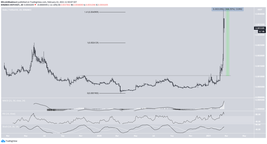Sponsored SponsoredMalgré des indicateurs techniques toujours haussiers, le HOT a atteint le niveau de retracement fibonacci externe de 1,61, à 0,004$, il est donc possible qu’il corrige à court terme avant de potentiellement reprendre son mouvement de hausse.