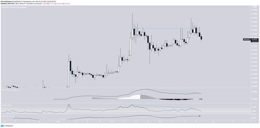 Le 13 février, l’altcoin DNT a atteint un sommet de 0,422$. Après une baisse considérable, il a à nouveau atteint des niveaux similaires le 20 mars.