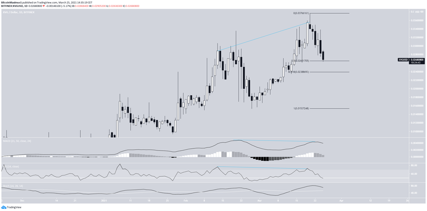 L’altcoin XVG est en baisse depuis le 20 mars, date à laquelle il a atteint un sommet de 0,0376$. La baisse a été précédée d’une divergence baissière du RSI et de la MACD. Cela dit, le RSI reste positif et la MACD est supérieure à 50.
