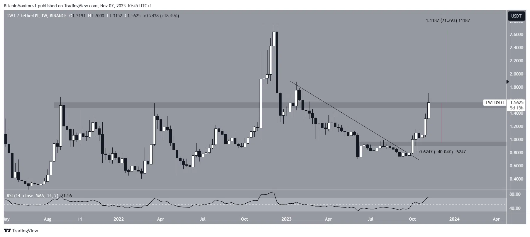 Le cours TWT a franchi une ligne de résistance descendante de long terme en octobre. Il a ensuite atteint un pic de 1,70 $ hier, légèrement en dessous de son sommet annuel de 1,87 $.