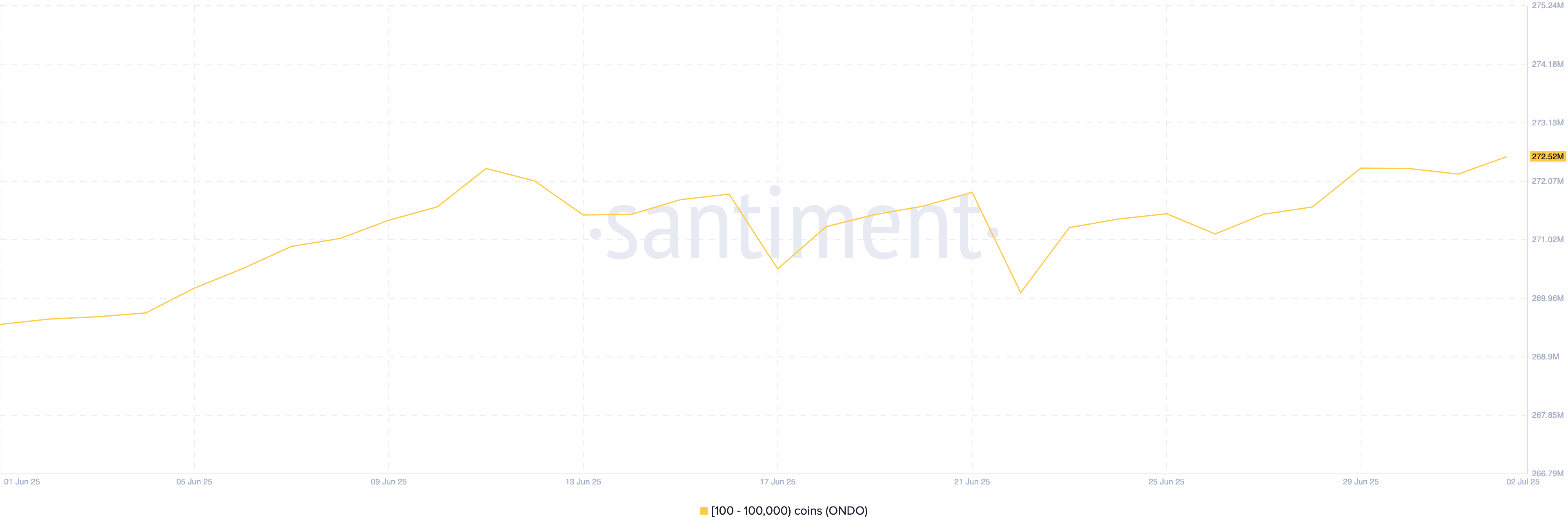 La crypto RWA, ONDO, est un autre des altcoins dont les baleines crypto ont porté de l’intérêt. Les données de Santiment montrent une augmentation notable de la détention de pièces par les adresses possédant entre 100 et 100 000 tokens ONDO.