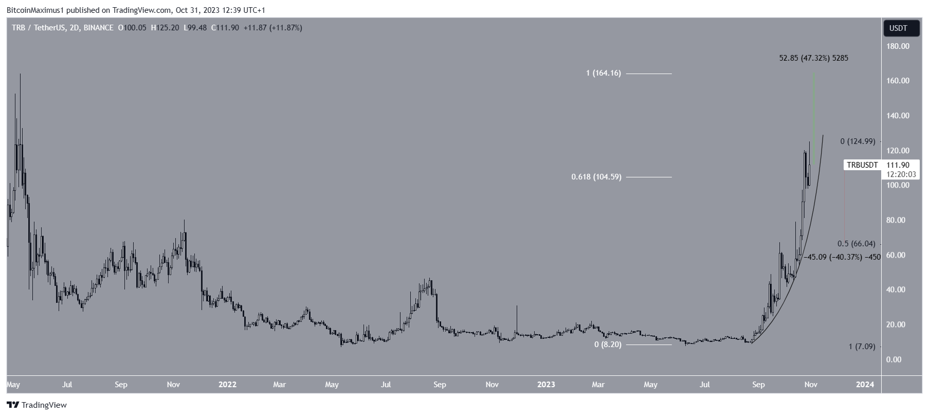 Sponsored SponsoredActuellement, TRB se négocie légèrement au-dessus du niveau de retracement Fib de 0,618 du dernier mouvement baissier vers la zone des 105 $. Il s’agit d’un niveau déterminant pour la trajectoire future du token.