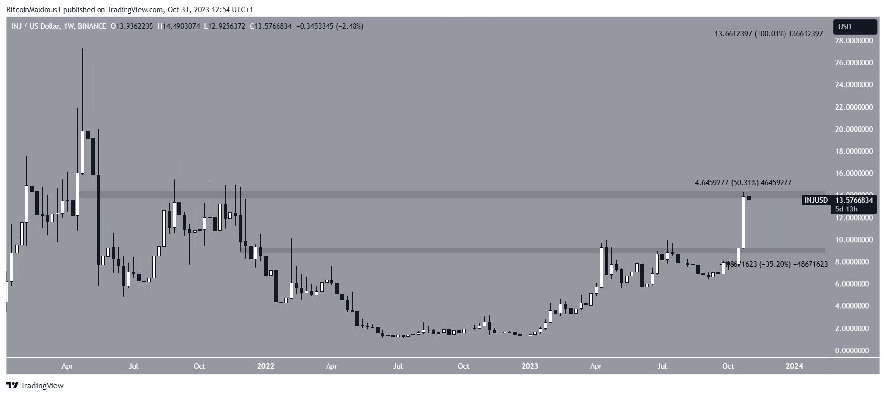 En conséquence, si INJ parvient à briser cette résistance, son prix peut doubler et atteindre le record historique de 27 $.