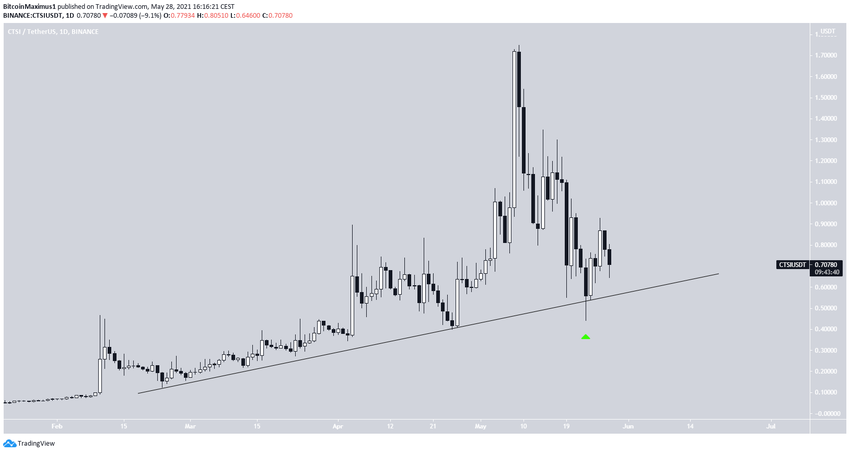 Le cours du CTSI suit une ligne de support descendante depuis le 21 février. Il a touché cette ligne pour la cinquième fois le 19 mai, avant d’amorcer son rebond actuel.
